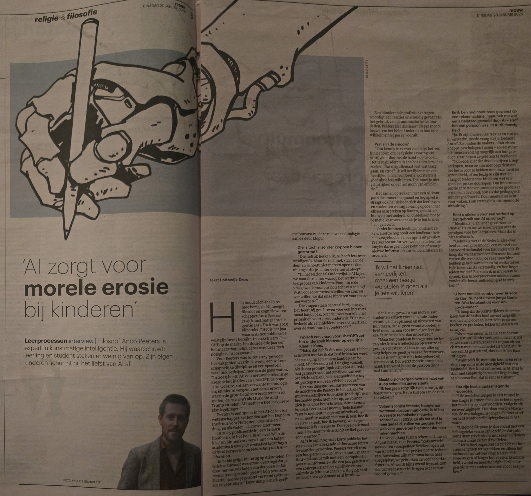 Het volgende artikel komt uit dagblad Trouw (20 januari 2026) en is geschreven door Lodewijk Dros (https://www.trouw.nl/religie-filosofie/filosoof-anco-peeters-trapt-op-de-rem-kijk-uit-met-ai-in-het-onderwijs~b28bc736/).
